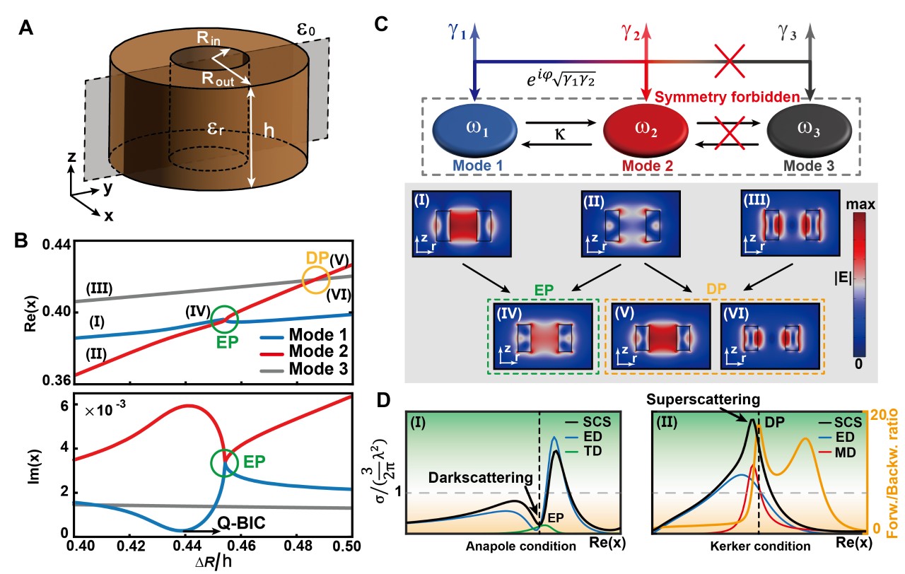 传统研究认为,非厄密系统中的奇异点需依赖复杂耦合结构实现。本研究通过调控单一环形介质谐振器的几何参数,在微波频段直接观测到EP与DP的散射谱特征(图1)。实验数据表明,EP对应散射暗态(Anapole State),而DP则呈现多模式共振叠加的超散射现象。这一发现将非厄密物理与米氏光子学深度融合,为光-物质相互作用调控开辟新维度。
